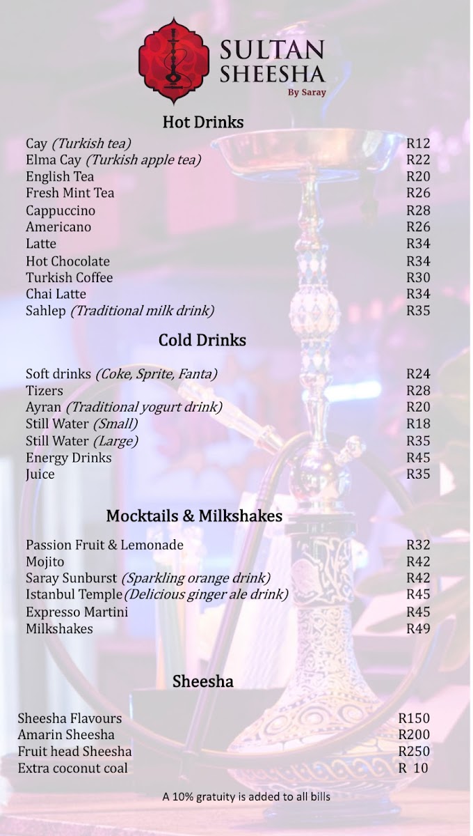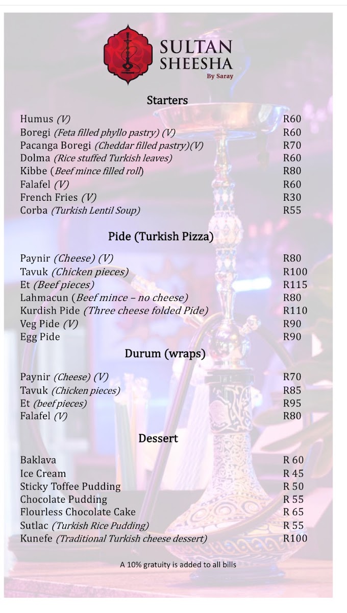 Overall, the menu at Sultan Sheesha presents a straightforward yet delightful journey through Turkish-inspired tastes, perfectly suited to those seeking comfort and conviviality in the heart of Cape Town’s Gardens neighborhood.